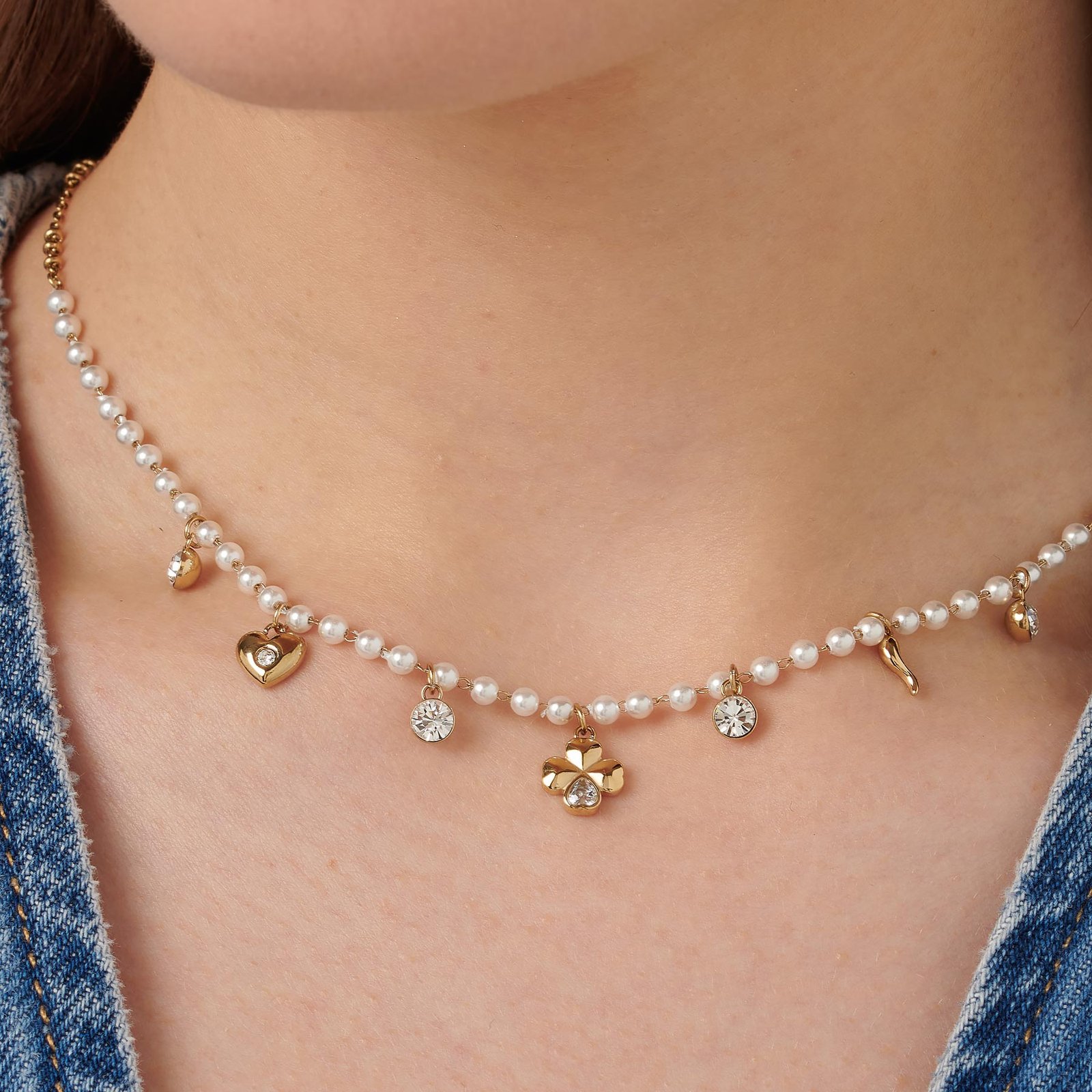 Collana da donna di Brosway della collezione Chakra. Modello realizzato in acciaio 316L e finitura pvd oro 14kt e perle di conchiglia, con pendenti portafortuna (quadrifoglio, cornetto,cuore). Lunghezza regolabile grazie alle campanelle finali. La referenza è BHKN130.